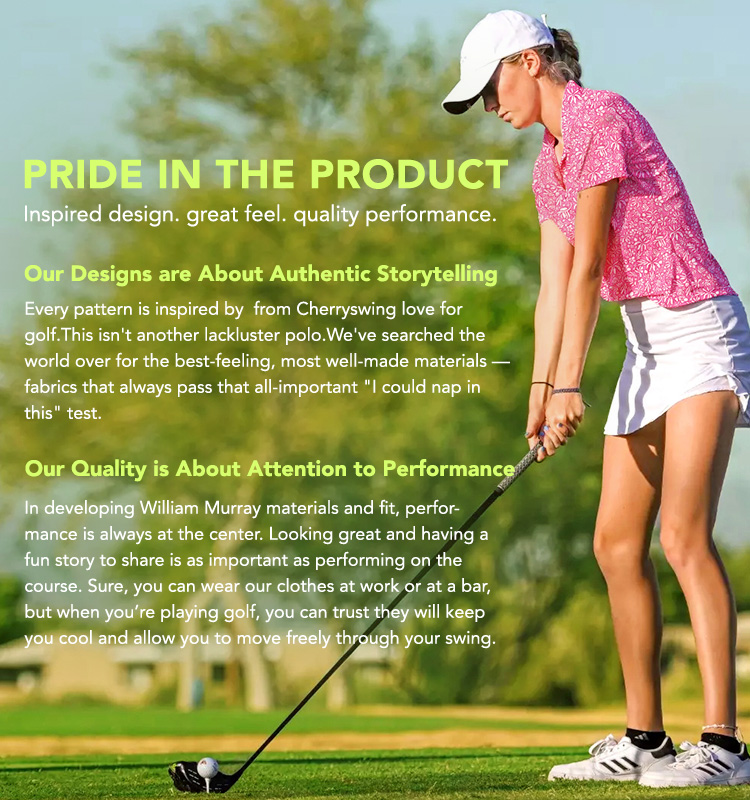 We carefully pick artistic print patterns and cleverly put them into the golf sportswear. Every piece of clothing carries my love for golf and my search for beauty. I hope that when you wear Cherryswing, you'll become the center of attention on the golf course. Every time you swing the club or smile, you'll shine brightly. We're not just selling clothes, we're passing on a way of life, a pursuit and insistence on good things.