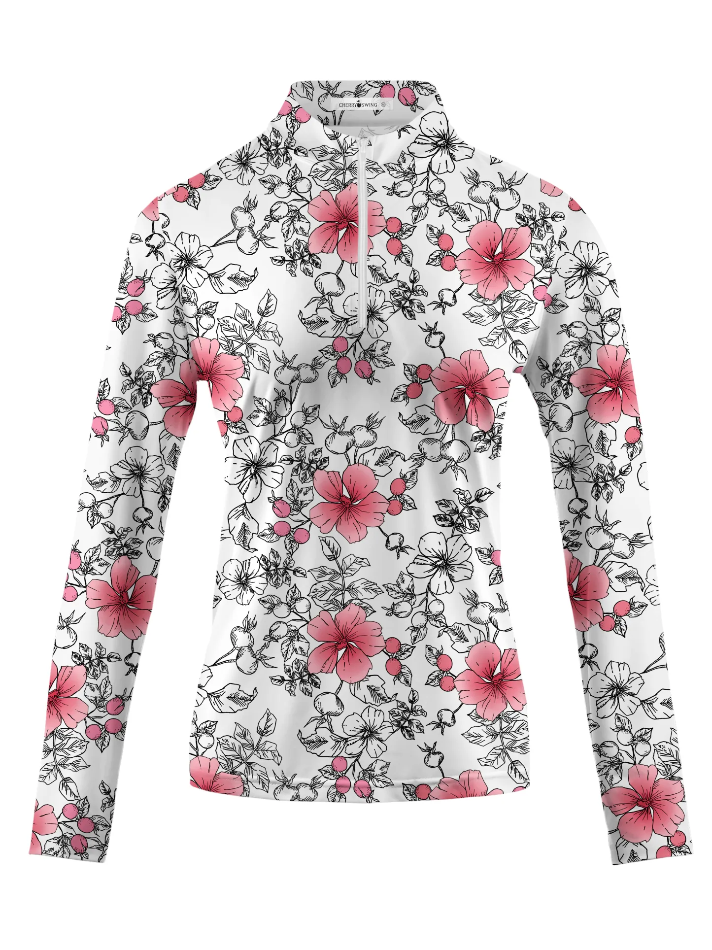In the soft glow of a spring morning, we, the blossoms of pink and white, find our reflection on a golfer's attire. Our petals, a dance of nature's grace, now embellish the fabric with a tale of renewal. Each flower, a brushstroke of the artist's hand, each leaf, a testament to the garden's charm. As the golfer swings, we carry the garden's spirit, a reminder of nature's serene beauty, where every stroke is a gentle breeze, a step into the world of elegance.